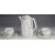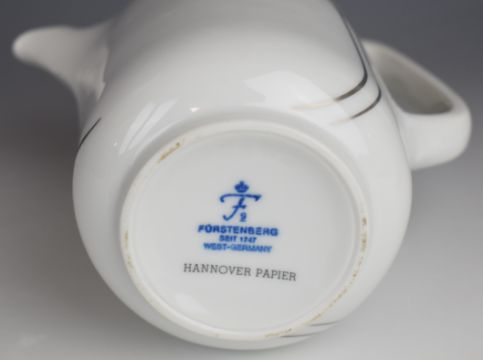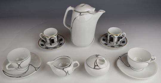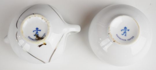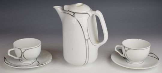 Furstenberg porcelain tea for two decorated in the Hannover Papier pattern and a pair of Rosenthal coffee cans in the Fornasett Dekor Paddaiana pattern, tallest 22cm