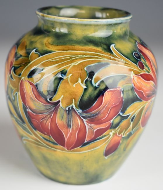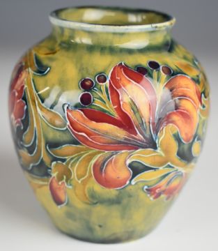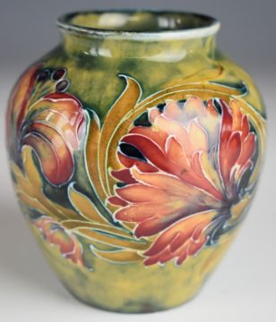 William Moorcroft vase decorated in the Spanish pattern on an early pale green ground, with early W. Moorcroft underlined signature to base, H10cm