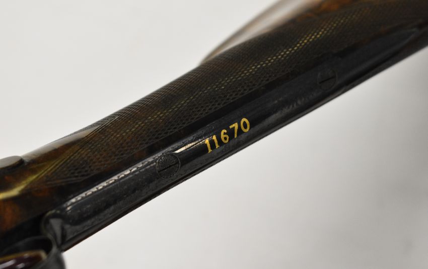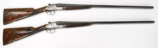 Pair of B E Chaplin of Winchester 20 bore assisted-opening sidelock side by side ejector shotguns each with gold inlaid naming, all over scrolling and floral engraving, chequered grip and forend, carved teardrop to the wrist, vacant gold cartouche to the underside of the stock, double trigger and named 28 inch barrels choked ¾ and full, numbered 1 and 2 in gold to the thumb lever, forend and barrels, overall length 115cm, length of pull 38cm, serial numbers 11670 and 11671, in original leather and brass bound fitted carry case with oil bottle, snapcaps and accessories. PLEASE NOTE THAT A VALID RELEVANT SHOTGUN CERTIFICATE IS REQUIRED TO VIEW OR PURCHASE THIS LOT AND FOR ALL SHOTGUNS OR RIFLES PLEASE ENSURE YOU HAVE THE RELEVANT CERTIFICATE BEFORE BIDDING.