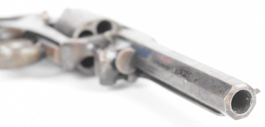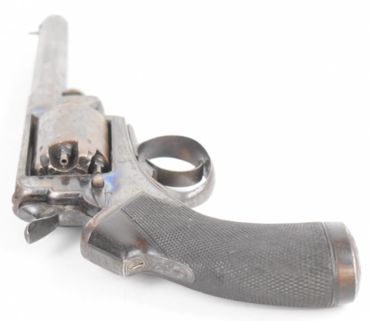 William & John Rigby Adam's patent 54 bore 5-shot double-action revolver with chequered wooden grips, line engraved frame stamped '21,391 Adams' Patent' and 5.75 inch rifled octagonal barrel engraved 'Willm & John Rigby, Dublin', overall length 32cm, serial number 37192.