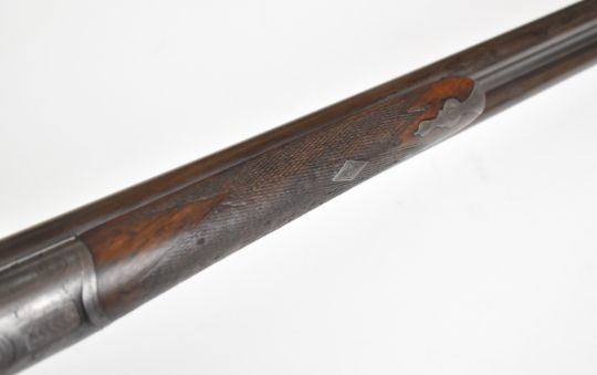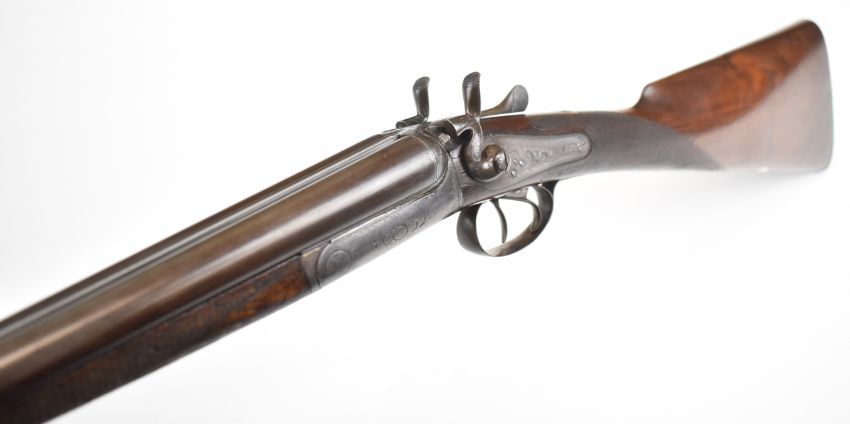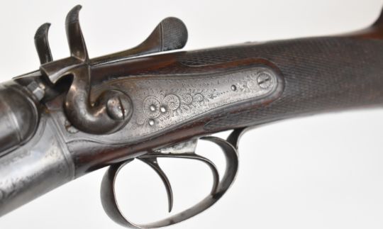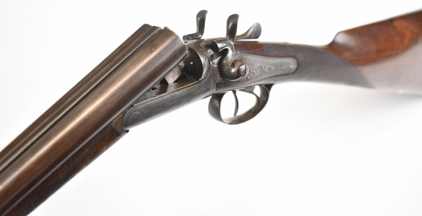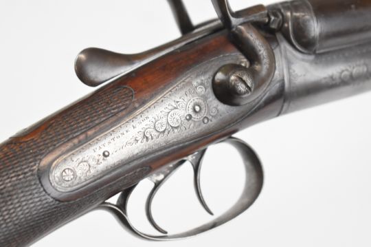 Patstone & Son of Southampton .410 side by side hammer action shotgun with named and engraved locks, engraved hammers, underside, trigger guard, top strap, thumb lever and fences, chequered grip and forend, vacant cartouche to the underside of the stock, double trigger and named 28 inch barrels, overall length 112cm, length of pull 36cm, serial number 2732. PLEASE NOTE THAT A VALID RELEVANT SHOTGUN CERTIFICATE IS REQUIRED TO VIEW OR PURCHASE THIS LOT AND FOR ALL SHOTGUNS OR RIFLES PLEASE ENSURE YOU HAVE THE RELEVANT CERTIFICATE BEFORE BIDDING.