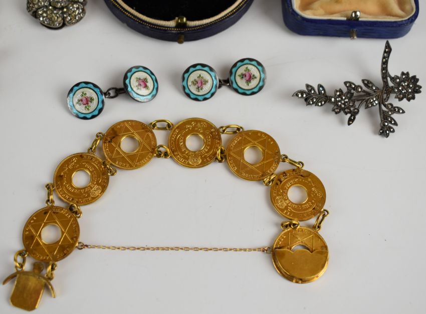 A pair of guilloché enamel cufflinks, silver brooch set with marcasite, paste clip, coral necklace, silver charm, coin charm bracelet and two vintage jewellery boxes