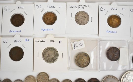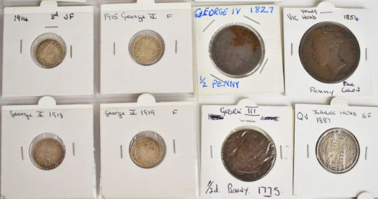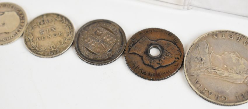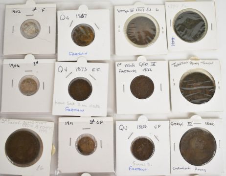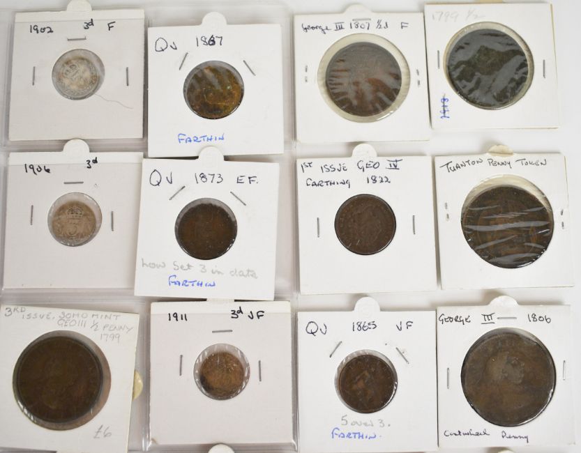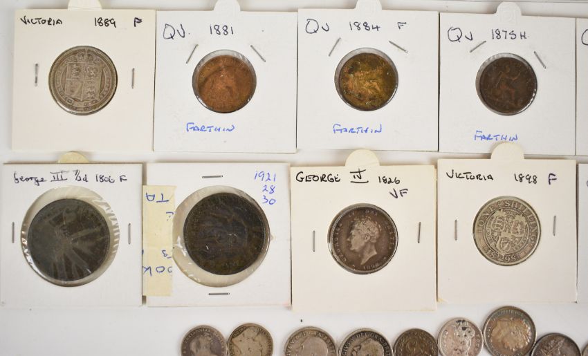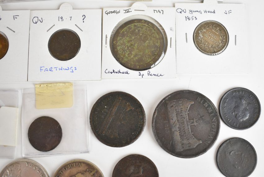 Approximately 240g of pre 1920 British silver coinage to include George III, George IV, Queen Victoria, Edward VII and George V, from double florin down to 3d, together with a quantity of mainly Georgian and Victorian copper coinage and a three pence and similar one penny Birmingham token