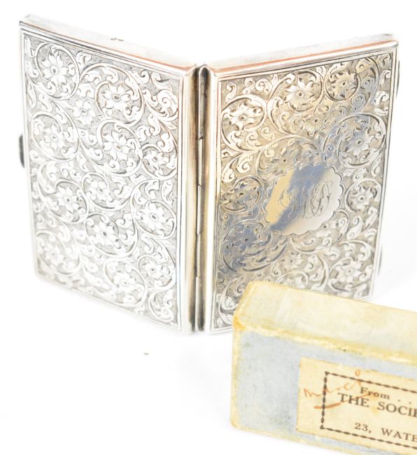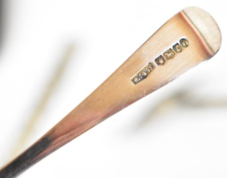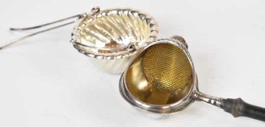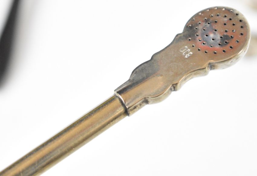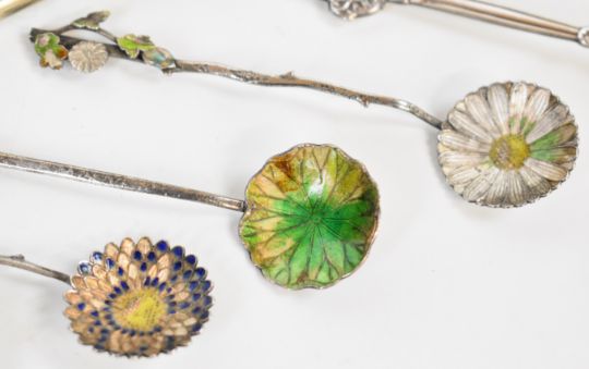 Hallmarked silver items comprising evening purse with fitted interior, length 8.5cm, Society of Miniature Rifle Clubs spoon in original box, silver cased folding scissors together with a pair of unmarked buckle shaped napkin clips, six silver and enamel floral spoons, silver plated Tiffany tea strainer, further silver plated strainer, bombilla straw marked 800 and an unmarked propelling pencil