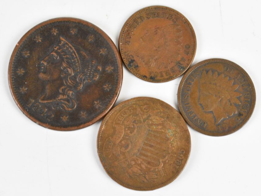 Five United States of America coins 1842-1902, consisting of a superb 1875 California Quarter Dollar (gold, 0.15g), an 1842 'Braided Hair' One Cent, an 1865 Two Cents, and two 'Indian Head' Cents 1884 and 1902