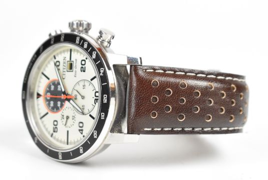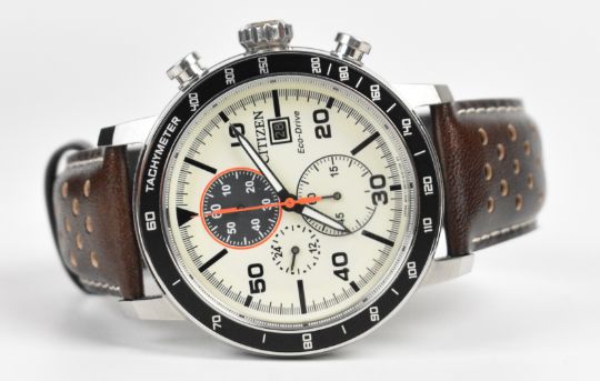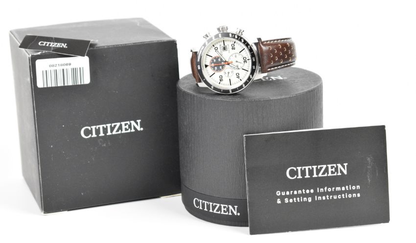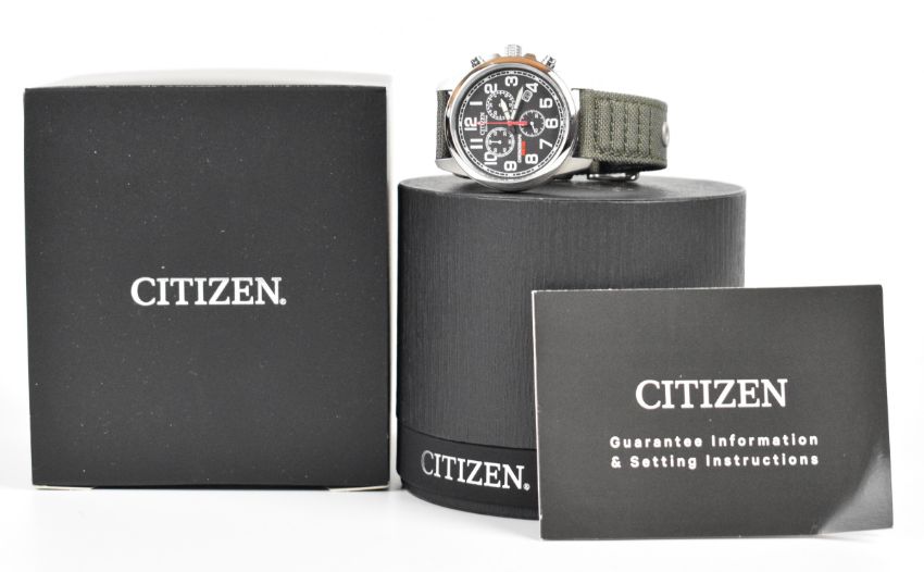 Two Citizen Eco-Drive gentleman's chronograph wristwatches ref. B612-8111684 with date aperture, luminous hands, black hour markers and bezel insert, cream dial and solar powered movement, on brown leather strap, case diameter 43mm, serial number 362031015 and ref. H500-S026989 military style with date aperture, luminous hands, white Arabic numerals, black dial and solar powered movement, on green fabric strap, case diameter 39mm, serial number 3N2030437, both in original boxes with guarantee and outer card box.