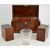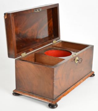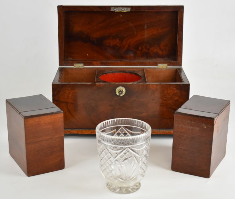 19th century flame mahogany tea caddy with mother of pearl escutcheon and raised on four squat bun feet, the lid opening to reveal two lidded storage boxes flanking a glass mixing bowl, length 35cm