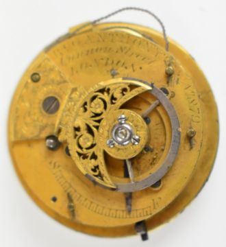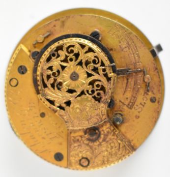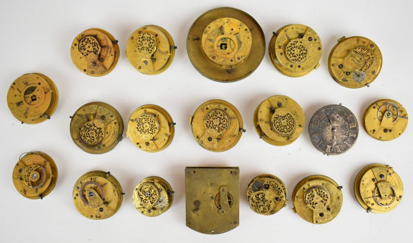 Nineteen mostly fusee watch movements including several London makers, Ganthiony, Eglese, William Webber of Woolwich, Sidding, Sam Marsh and Jones of 62 Cornhill and other makers from Dursley, Chalford, Gloucestershire, Yeovil, Poole, Ipswich etc