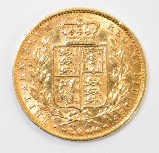 1852 Queen Victoria gold full sovereign with young head and shield reverse, VF