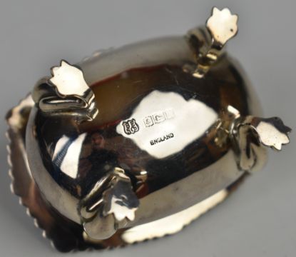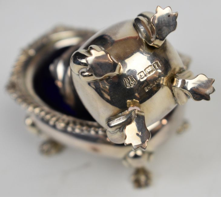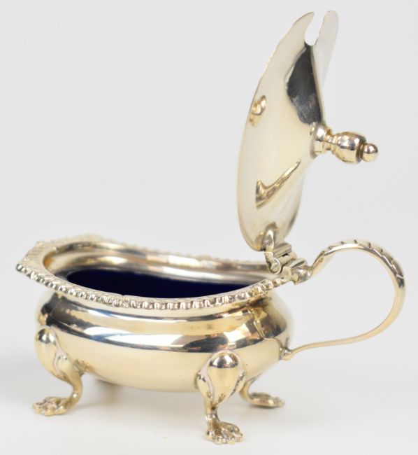 Modern hallmarked silver three piece cruet set comprising pepper, salt, mustard and two spoons, the main pieces Birmingham 1968, maker of all pieces Barker Ellis Silver Co, weight excluding blue liners 137g