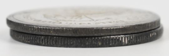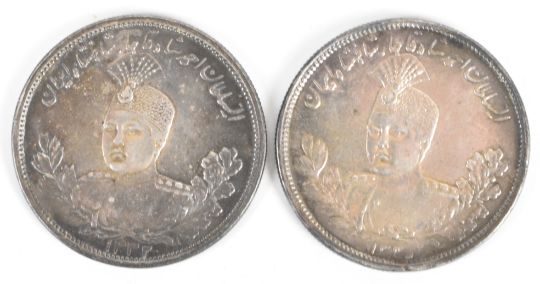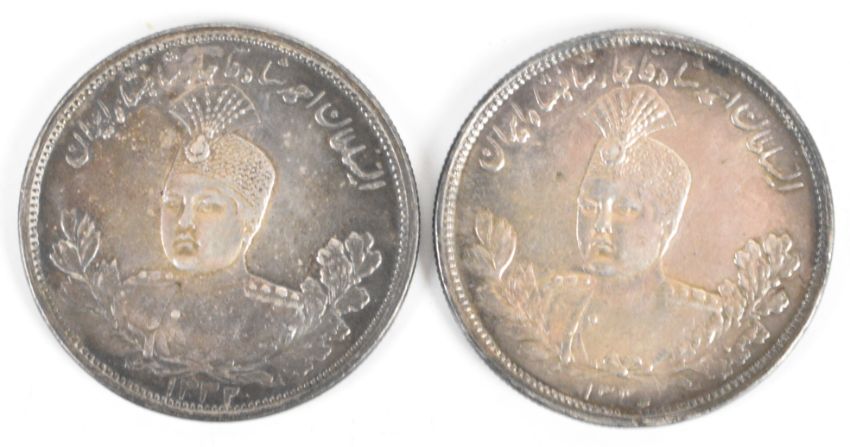 Two high-grade Iran silver 5000 Dinars coins from the reign of Ahmad Shah Qajar dated AH1332 (1913) and AH1335 (1916), one engraved with the emblem of the 13th Regiment (Prince Albert's) Somerset Light Infantry that features the battle honour 'Jellalabad' and is surrounded by the words 'Persia' and 'Mesopotamia'.