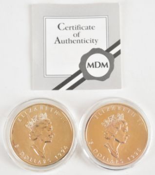 Two Canadian maple leaf 1oz silver coins comprising 1994 and 1995, one with MDM The Crown Collections Limited certificate