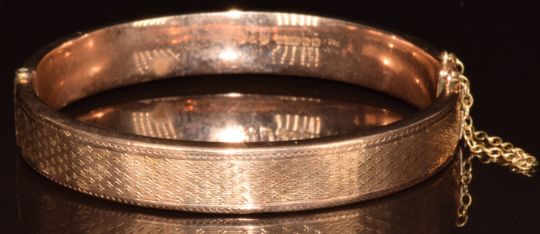 A 9ct gold bangle with patterned decoration, Birmingham 1937, 11.2g