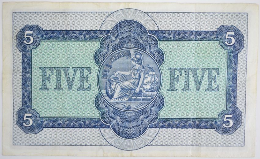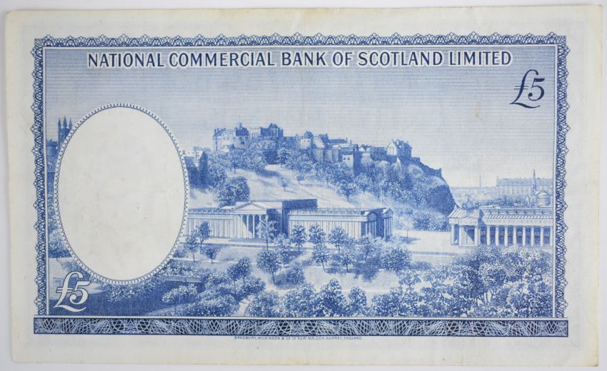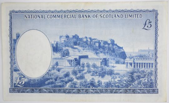 Seven Scotland £5 banknotes 1964-1969 consisting of a 1964 National Commercial Bank of Scotland £5 note, 1964 British Linen Bank £5 note, 1967 Royal Bank of Scotland £5 note and four Bank of Scotland £5 notes dated 1968 or 1969; all have seen circulation, the portrait of the 1964 British Linen Bank note is marked with the number '80'