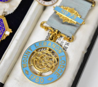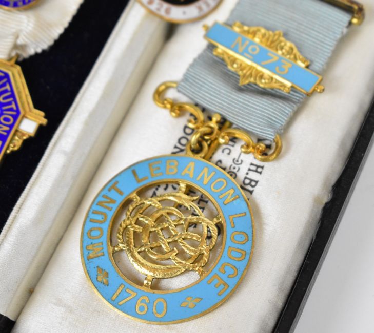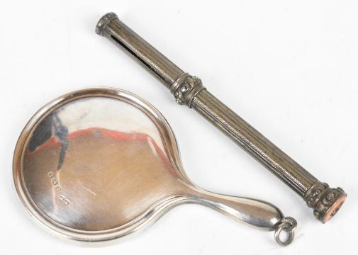Two silver gilt Masonic interest jewels comprising Royal Masonic Institution for Girls Steward 1937 and Mount Lebanon Lodge 1760, Manchester Civic Week 1926 badge, novelty hallmarked silver miniature hand mirror and a Mordan or similar propelling pencil