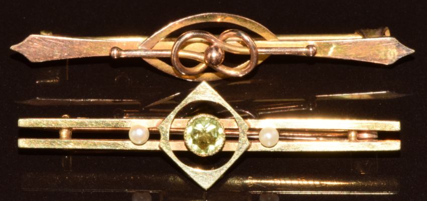Edwardian 15ct gold brooch set with a peridot and pearls (2.2g) and a 9ct gold brooch (1.5g)