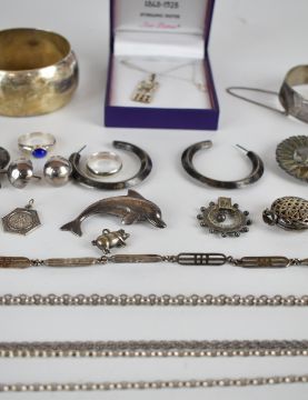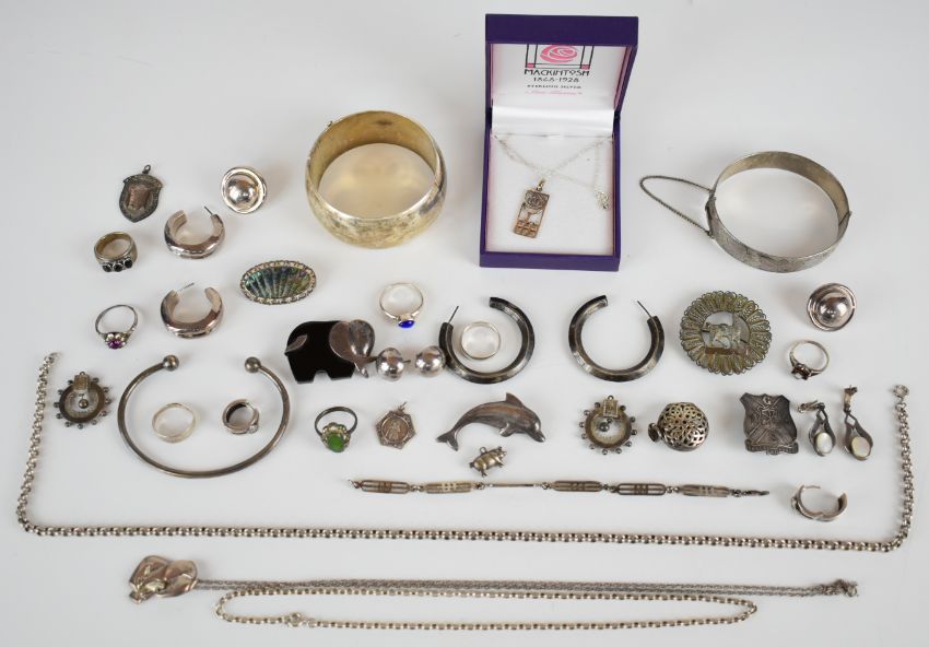 A collection of silver jewellery including locket, two bangles, seven rings, six pairs of earrings, two brooches, abalone brooch, elephant necklace, chain, St Christopher, pig charm, belcher chain/ necklace, torque bangle, bracelet, etc, 305g