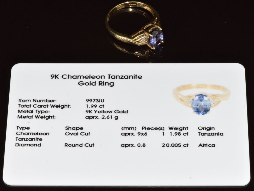 A 9k gold ring set with an oval cut Chameleon tanzanite of approximately 1.9ct and diamonds, 3g, size N