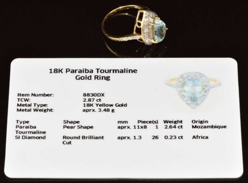 An 18k white gold ring set with a pear cut Paraiba tourmaline of approximately 2.6ct surrounded by diamonds, with certificate, 4g, size N