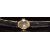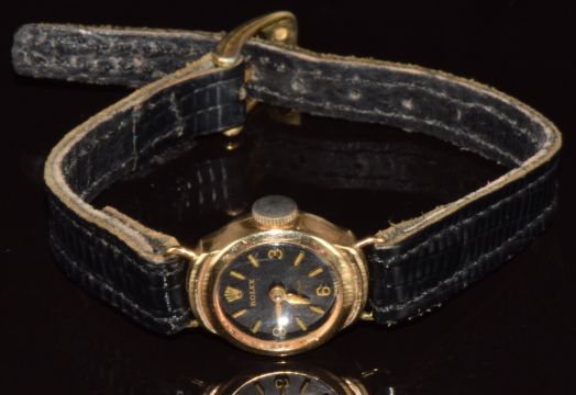 Rolex Precision 9ct gold ladies wristwatch with gold hands, hour markers and Arabic numerals, black dial and signed 17 jewel movement, on black leather strap, case diameter 17mm, serial number 315159.