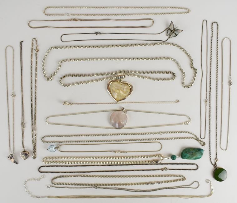 Twenty silver chains / necklaces including mother of pearl, nephrite jade, turquoise, etc, 268g