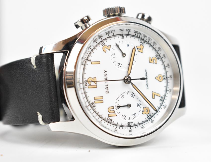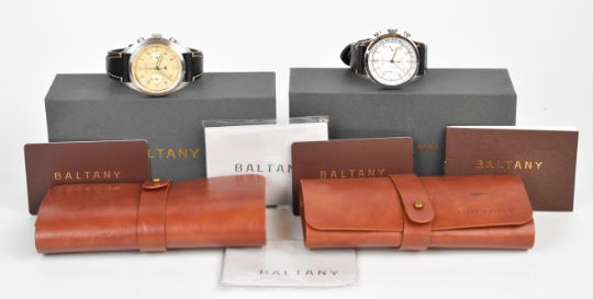 Two Baltany gentleman's chronograph wristwatches, one British Royal Navy military nuclear submarine style with ministry broad arrow to the dial, both with luminous hands, Arabic numerals and stainless steel case, largest case diameter 40mm, both in original boxes with leather travel pouches and related paperwork.