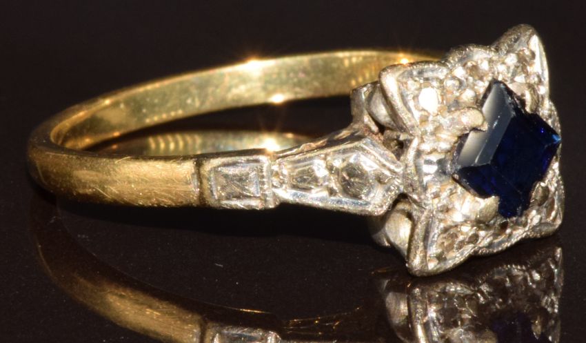 An 18ct gold ring set with a square cut sapphire and diamonds in a platinum mount, 4.1g, size O