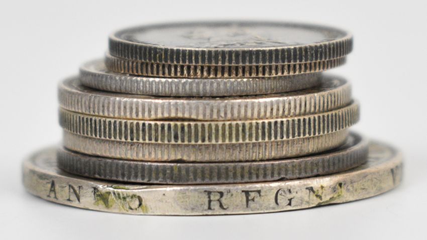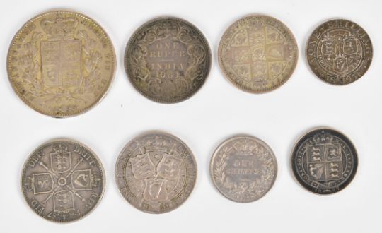 Approximately 90g of Victorian silver coinage to include an 1844 crown, higher grade 1872 shilling and a 1901 Indian rupee