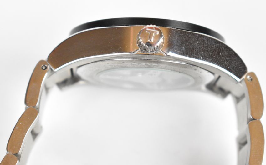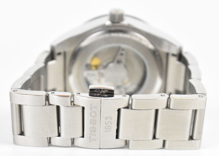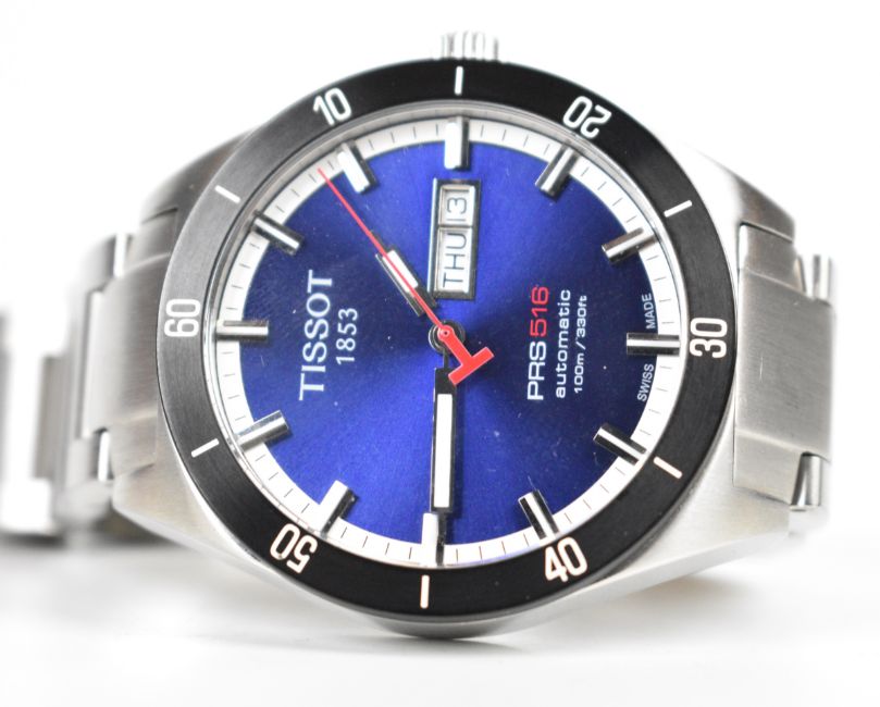 Tissot PRS516 gentleman's automatic wristwatch ref. 15BC0263483 with day and date aperture, luminous hands and hour markers, red centre seconds hand, blue dial, black bezel, clear exhibition case back, stainless steel case and signed 25 jewel movement, on stainless steel bracelet, case diameter 42mm.
