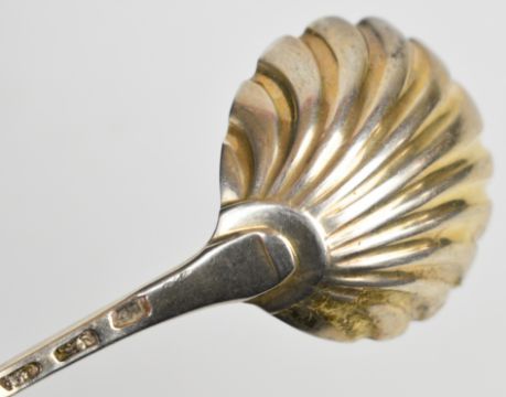 Pair of Georgian bottom hallmarked silver Onslow pattern ladles with shell bowls, London 1768, maker's mark WT or WJ, length 17cm, weight 99g