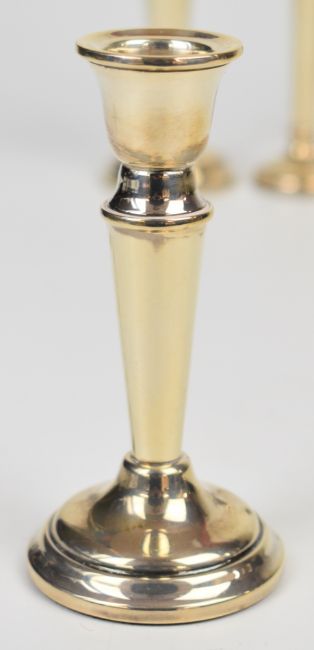 Pair of modern hallmarked silver candlesticks, height 11cm, pair of hallmarked silver trumpet vases and a pair of silver mounted glass peppers marked 925 sterling Mexico to bases