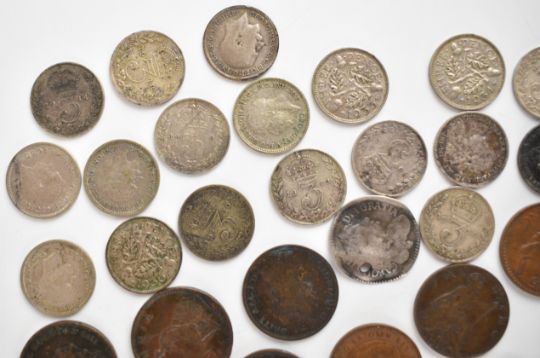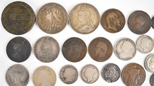 Mainly Georgian and Victorian coinage to include 1887 and 1897 crowns, drilled Charles II love token coin, cartwheel twopence and a small quantity of world coinage, approximately 16g pre-1947 and 147g pre-1920