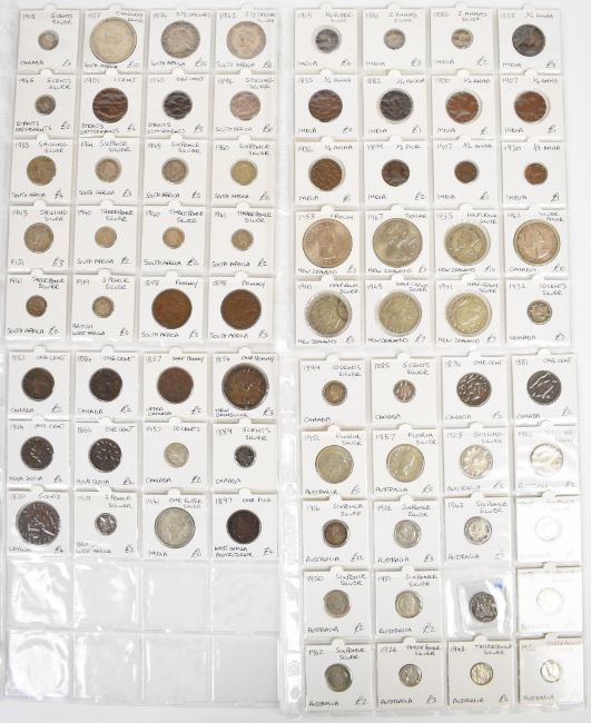 Collection of Commonwealth silver and base metal coins from Canada, India, Australia, South Africa, New Zealand, Straits Settlements, Nova Scotia and Ceylon, 1835-1967; including Canada 1889 5 Cents, 1885 5 Cents and 1899 10 Cents, Australia 1916 Sixpence and One Shilling, India 1841 (East India Company) 2 Annas and 1886 2 Annas, a South Africa 1894 2½ Shillings and an 1879 Ceylon 5 Cents