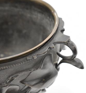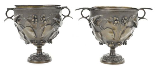 Pair of 19th/20thC continental bronze urns with grape and vine decoration in relief, diameter 11, height 12.5cm