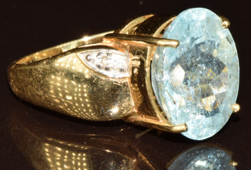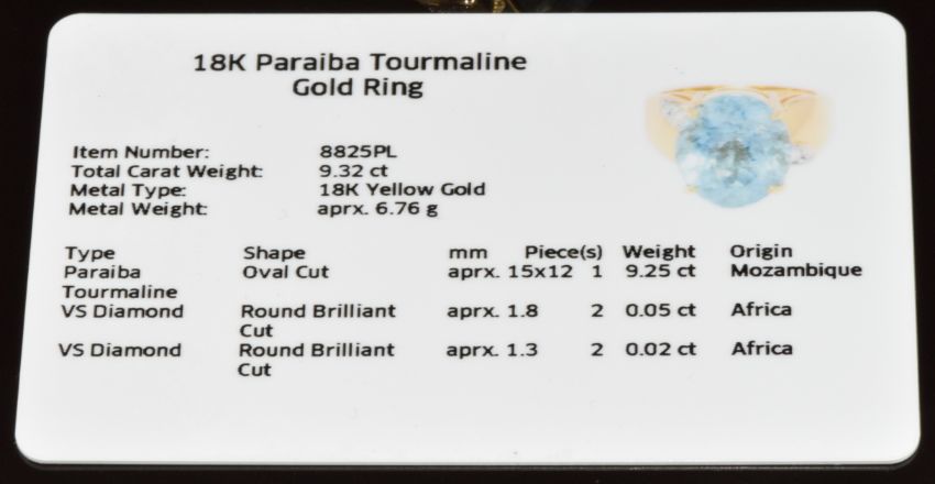 An 18k gold ring set with an oval cut Paraiba tourmaline of approximately 9.2ct and diamonds, with certificate, 8.4g, size N