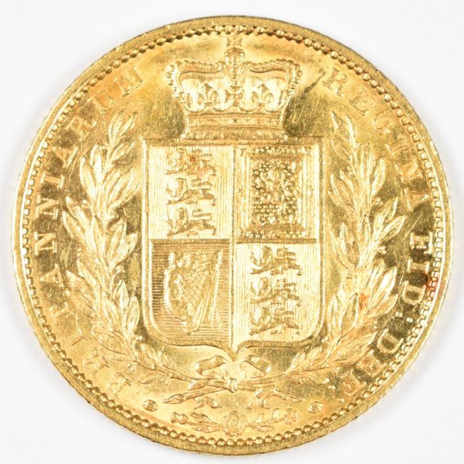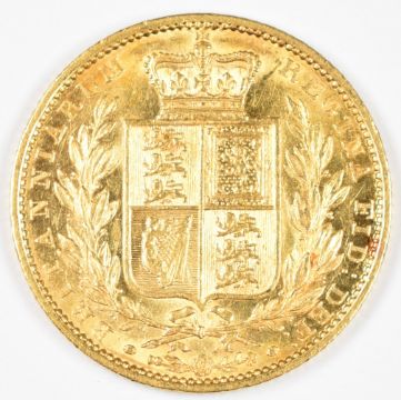 1848 Queen Victoria gold full sovereign with young head and shield reverse, EF