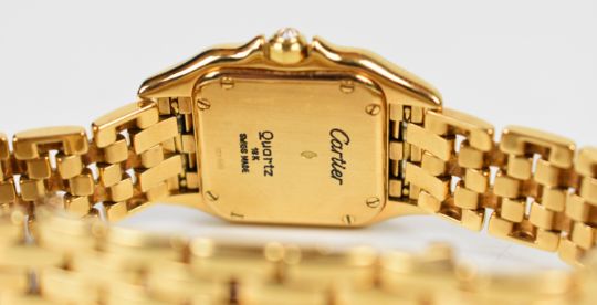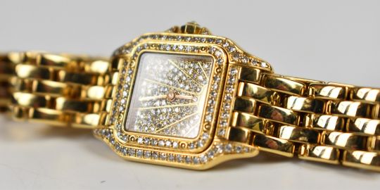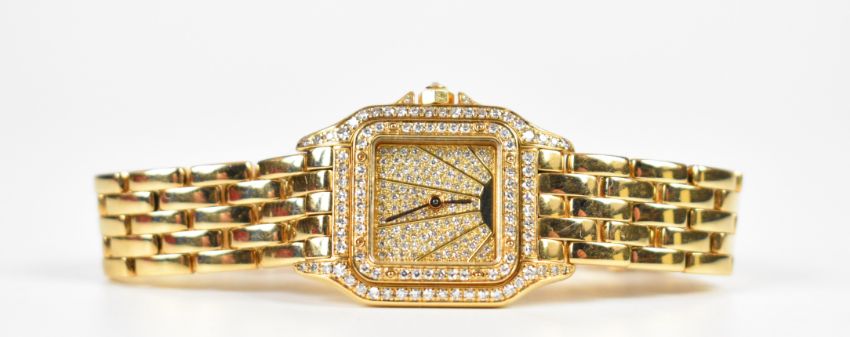 Cartier Panthère 18ct gold ladies wristwatch with diamond set Sunburst dial, gold hands, diamond set bezel and case and quartz movement, on 18ct gold bracelet, case diameter 22mm, serial number 8669197409, 69.8g, in original fitted box.