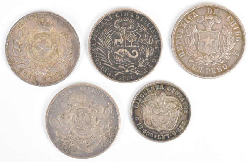 Five 19th century South American silver coins 1866-1896, including an 1877 Chile 1 Peso, an 1866 Mexico 1 Peso, an 1888 Brazil 2000 Reis, an 1896 Peru 1 Sol and an 1892 Colombia 50 Centavos