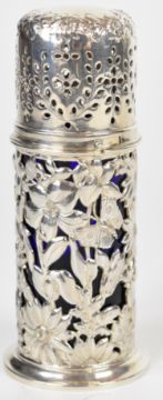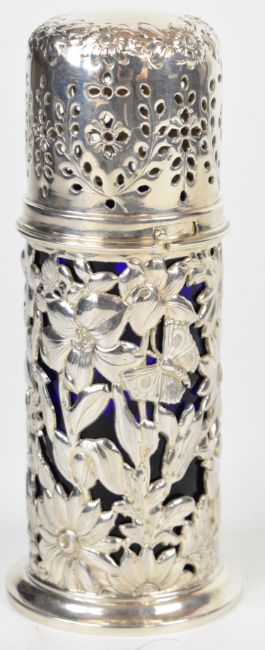 Victorian hallmarked silver sugar sifter with blue glass liner, embossed floral decoration and bayonet cap, London 1897, maker Horace Woodward & Co Ltd, height 14cm, weight excluding liner 130g