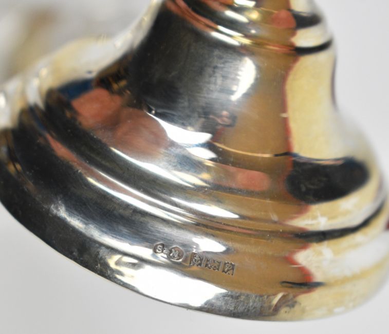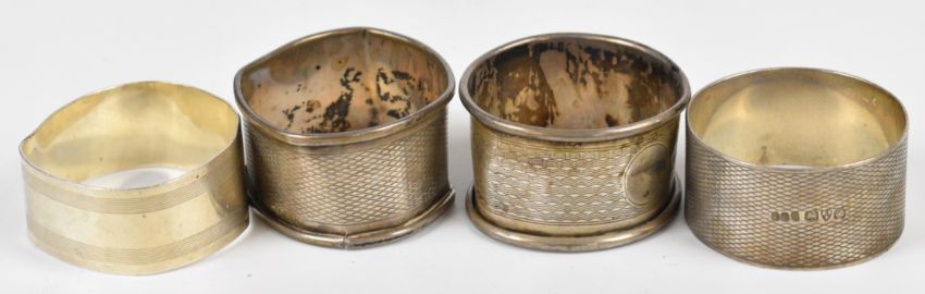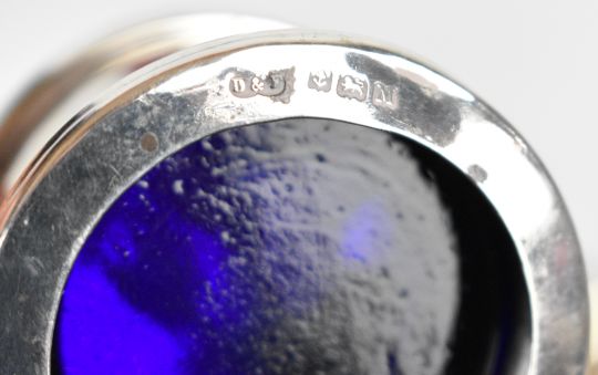 Hallmarked silver items comprising four napkin rings, pair of ashtrays, open salt and mustard with blue glass liners and spoons to suit, pepper grinder, pill pot, thimble, pair of candlesticks and two silver mounted cut glass items, height of tallest cut glass bottle 13.5cm, 191g weighable silver