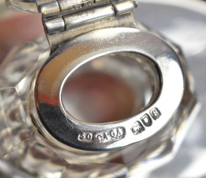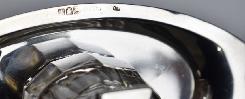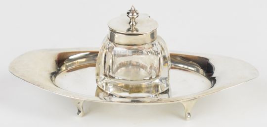 Charles & George Asprey Victorian or Edward VII hallmarked silver standish or inkwell on tray of oval form, raised on four feet, London 1901, length 14.5cm, weight of base 54g