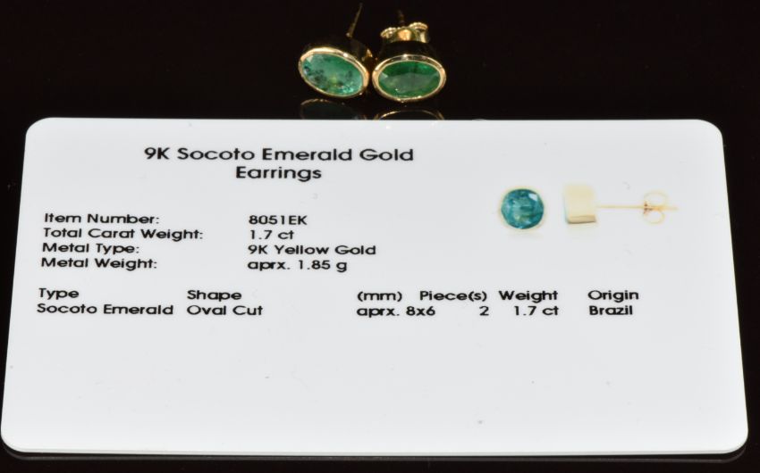 A pair of 9k gold earrings each set with an oval cut Socoto emerald, total carat weight approximately 1.7ct, with certificate, 2.1g