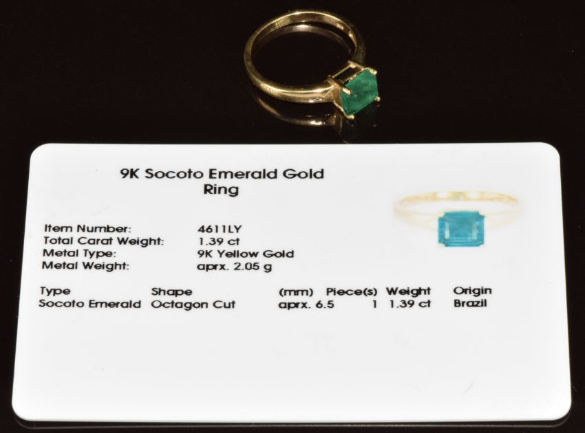 A 9k gold ring set with an octagonal cut Socoto emerald of approximately 1.3ct, 2.4g, size N