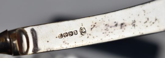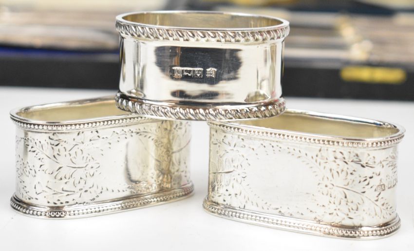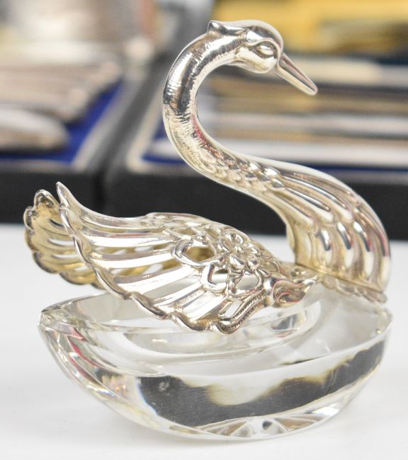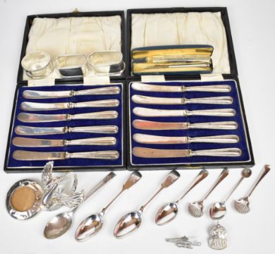 Hallmarked silver items comprising seven various spoons, three napkin rings, ARP badge, Baker's Per M-Point pencil, photograph frame, novelty swan salt, two cased sets of knives and a chrome or similar Edward VIII brooch, 210g weighable silver