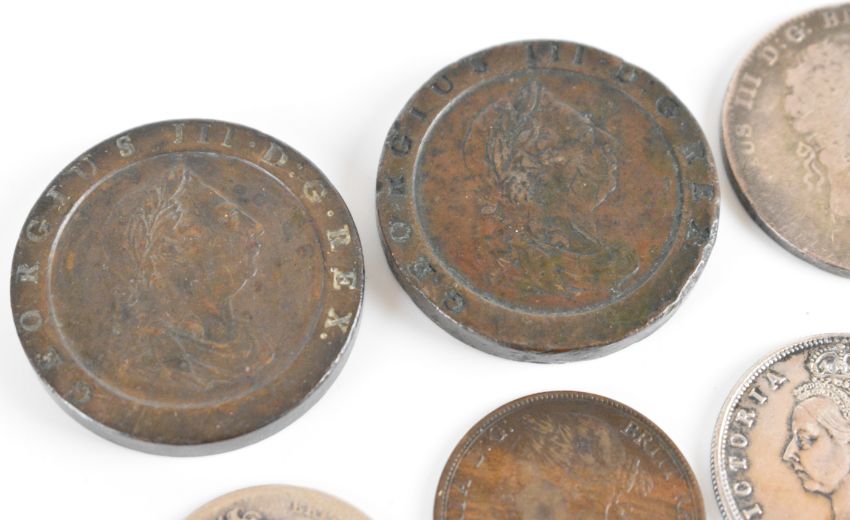 Approximately 333g of Georgian, Victorian, Edward VII and later pre-1920 British silver coinage together with two cartwheel twopence coins, 19th century copper coinage, mainly Victorian, four tokens comprising Haverhill, John Horne Tooke, John Wilkinson Iron and Norwich and a novelty box formed as Georgian pennies