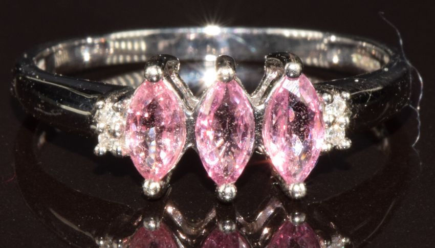 An 18k white gold ring set with three marquise cut Padparadscha sapphires and diamonds, size N/O