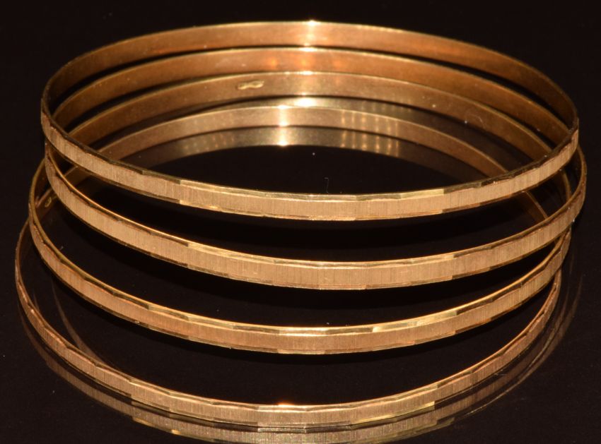 Four 18ct gold Italian bangles with textured decoration, 29.6g