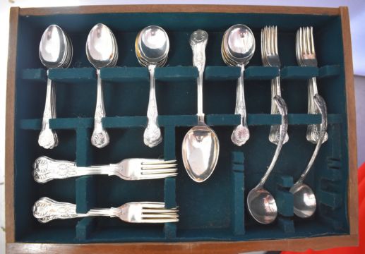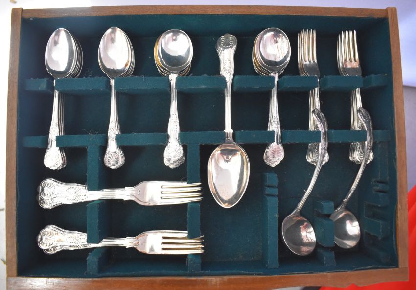 Roberts & Dore silver plated King's pattern twelve place setting canteen of cutlery, in wooden canteen with lift up lid and drawer below, raised on four legs, height 77cm