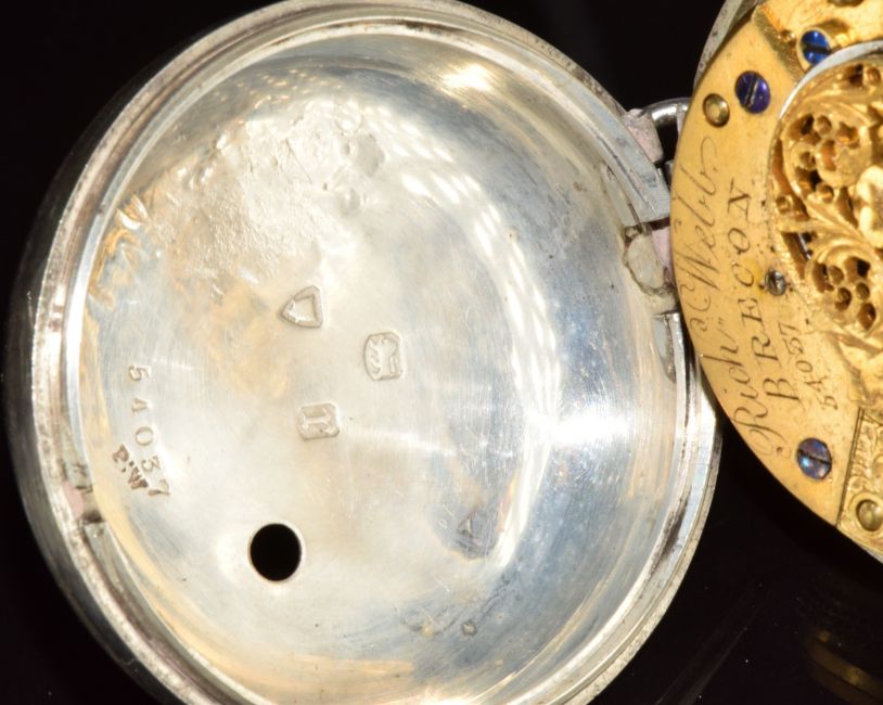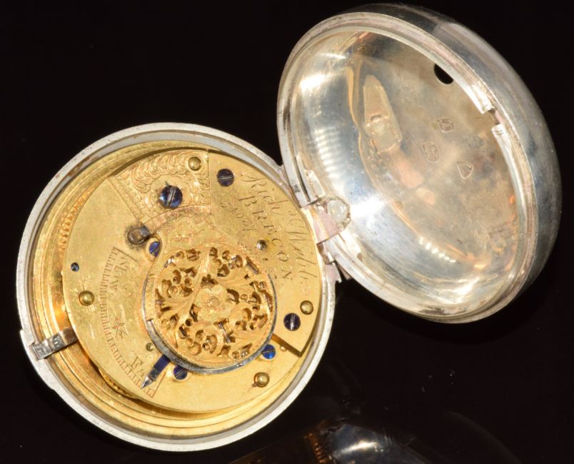 Richard Webb of Brecon hallmarked silver pair cased half hunter pocket watch with gold hands, black Roman numerals, white dial and signed, pierced and engraved fusee movement, case diameter 54mm, serial number 54037.