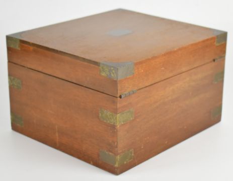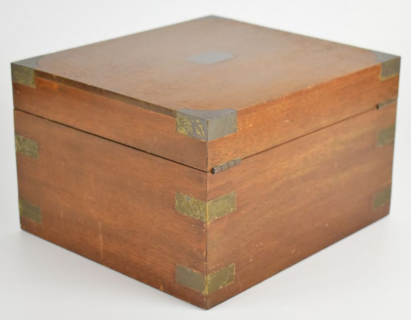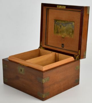 Dunhill of London brass bound mahogany cigar humidor with lined interior and inset Dunhill nameplate to interior, W25 x D23 x H15cm